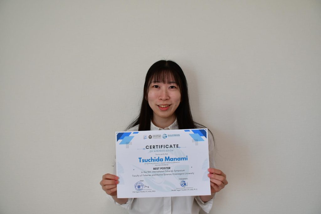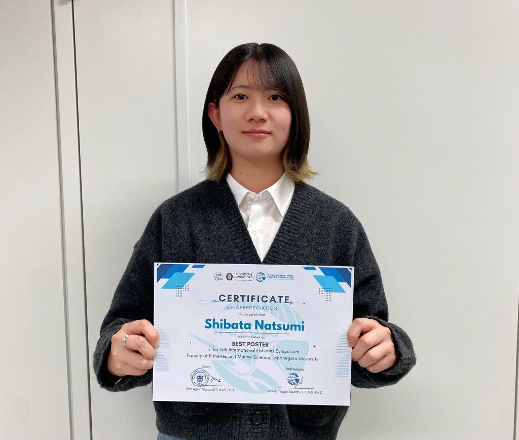 PrizesAt the 13th International Fisheries Symposium (IFS2025) held at Diponegoro University (Indonesia) from October 6 to 9, 2025, YAMADA Kanta (1st-year master’s student) received the Best Presenter Award, while TSUCHIDA Manami (2nd-year master’s student) and SHIBATA Natsumi (1st-year doctoral student) each received the Best Poster Award.